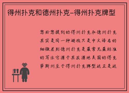 您好!您提到的“得州扑克”和“德州扑克”其实是同一种游戏,只是中文译名的细微差别。“德州扑克”是最常见、最标准的写法,它源于其发源地——美国的得克萨斯州。 至于“得州扑克牌型”,这正是这个游戏的核心之一。下面为您详细解释德州扑克的牌型大小顺序,从最强到最弱排列。 德州扑克牌型排名(从大到小) | 排...